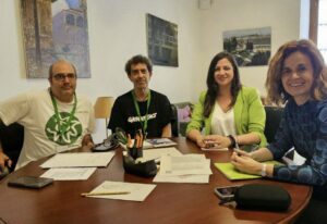 La coportavoz de Verdes EQUO en Andalucía, Mar González, y la presidenta de Más País Andalucía, Esperanza Gómez, se reunieron este lunes 22 de abril en el Parlamento andaluz, con Luis Reina e Isidoro Albarreal, representantes de Greenpeace y Ecologistas en Acción respectivamente, para escuchar sus demandas para que se suspendan los trámites de autorización para la reapertura de la Mina de los Frailes, de Aznalcóllar, tristemente famosa por el vertido de Bolidén de gravísimas consecuencias medioambientales.